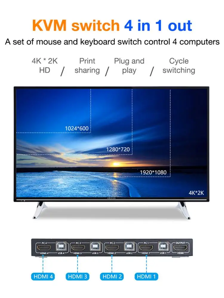 Related Product for High Quality HDMI KVM Switch 4 in 1 Out HDMI Switcher USB Hub Connect Switch for Laptop PS4 PS3 and