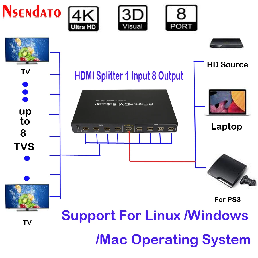 .image of 1 In 8 Out 4k HDMI Adapter Splitter 1X8 4Kx2K 30Hz HDMI Switcher Converter For 3D HD DTS Dolby LPCM